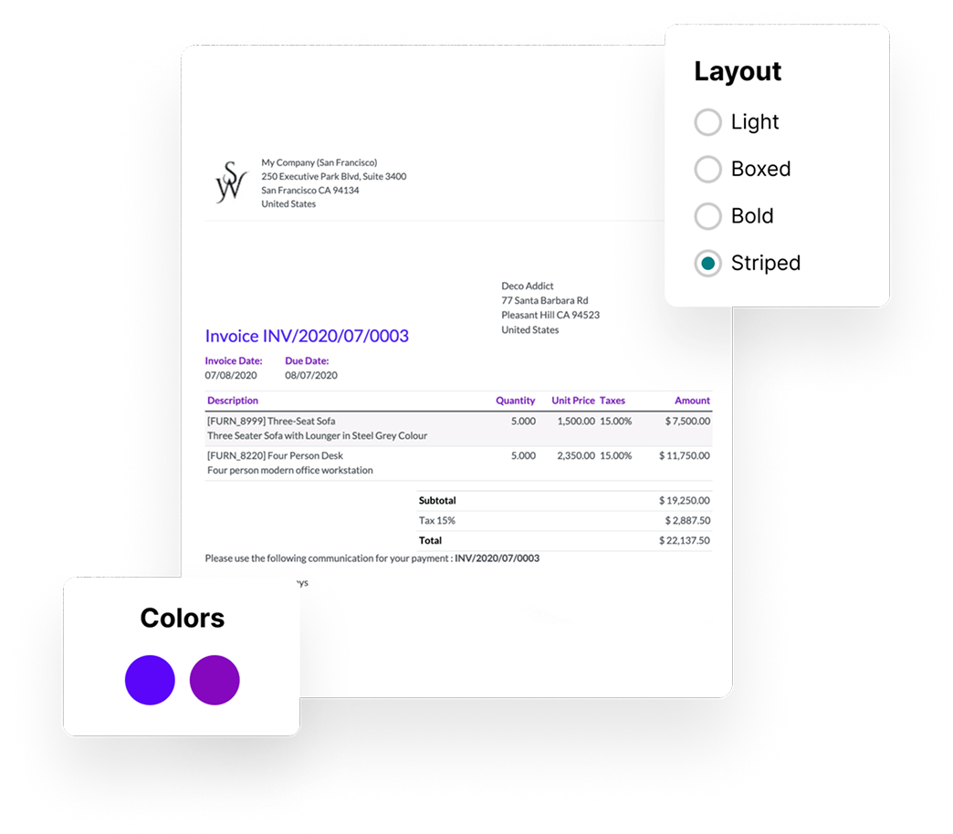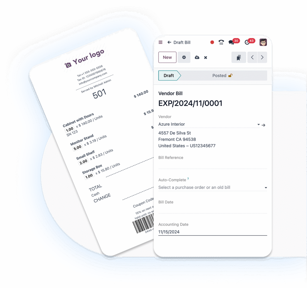 Odoo Accounting comes ready with pre-configured settings that perfectly match your country’s requirements. It covers charts of accounts, tax regulations, specialized reporting, electronic invoicing, audit files, and fiscal positions. This guarantees that the right tax rates and account assignments willĀ apply automatically.⨠Localization packages for UAE, Kuwait, Lebanon, Iraq, KSA, Qatar, Oman, Bahrain, Jordan.