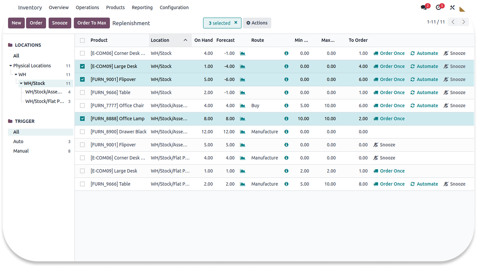 Organize your warehouse with Odoo’s double-entry inventory system. No messy input/output steps, just smooth movement between locations. Get faster process times, fewer errors, and complete control over every stock move.
